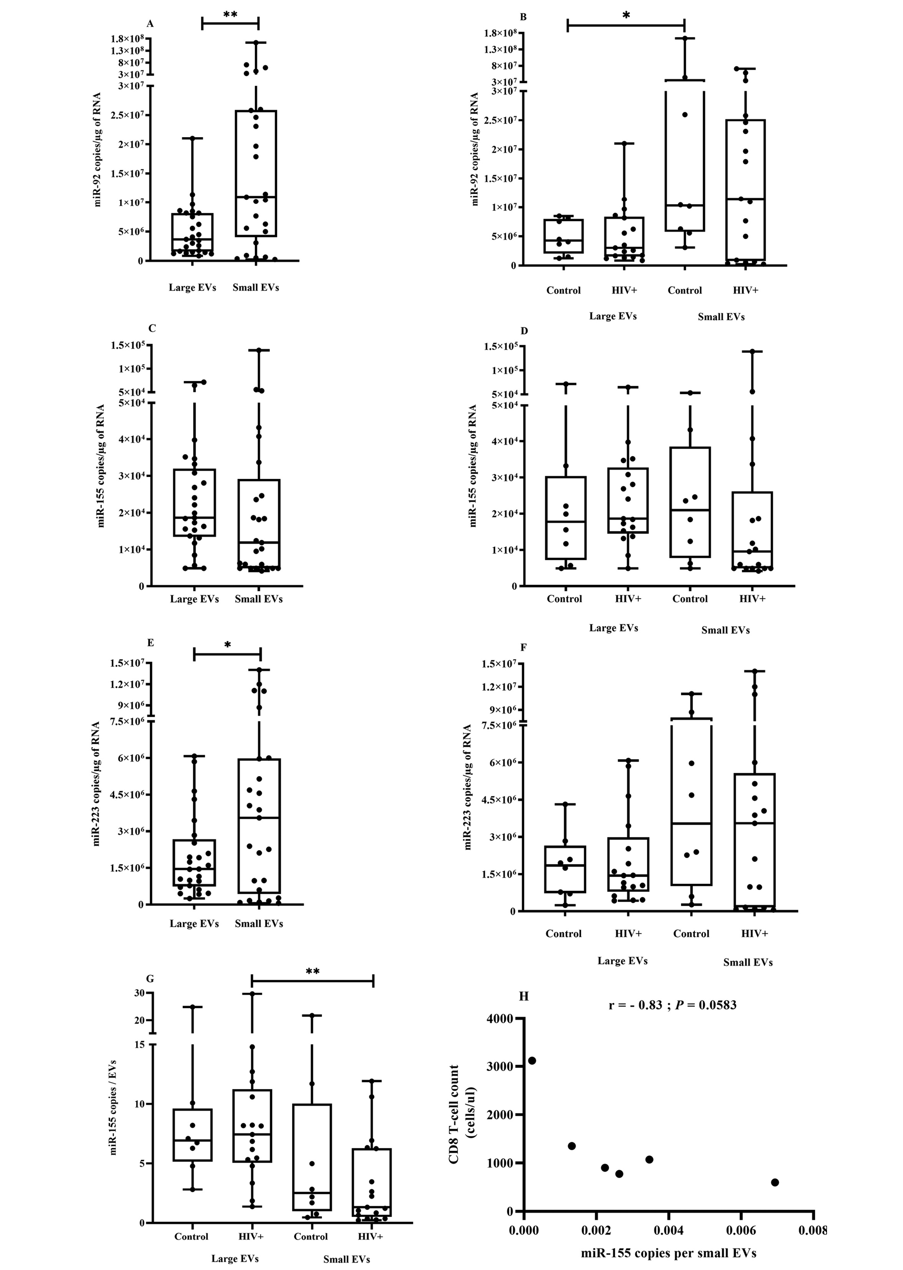 Methods: Plasma EVs subtype purified from PLWH and uninfected controls were sized using dynamic light scattering and quantified using flow cytometry and acetylcholine esterase (AChE) activity. Expression of mature miRNAs miR-92, miR-155, miR-223 was measured by quantitative reverse-transcriptase polymerase chain reaction in EVs and leucocytes.