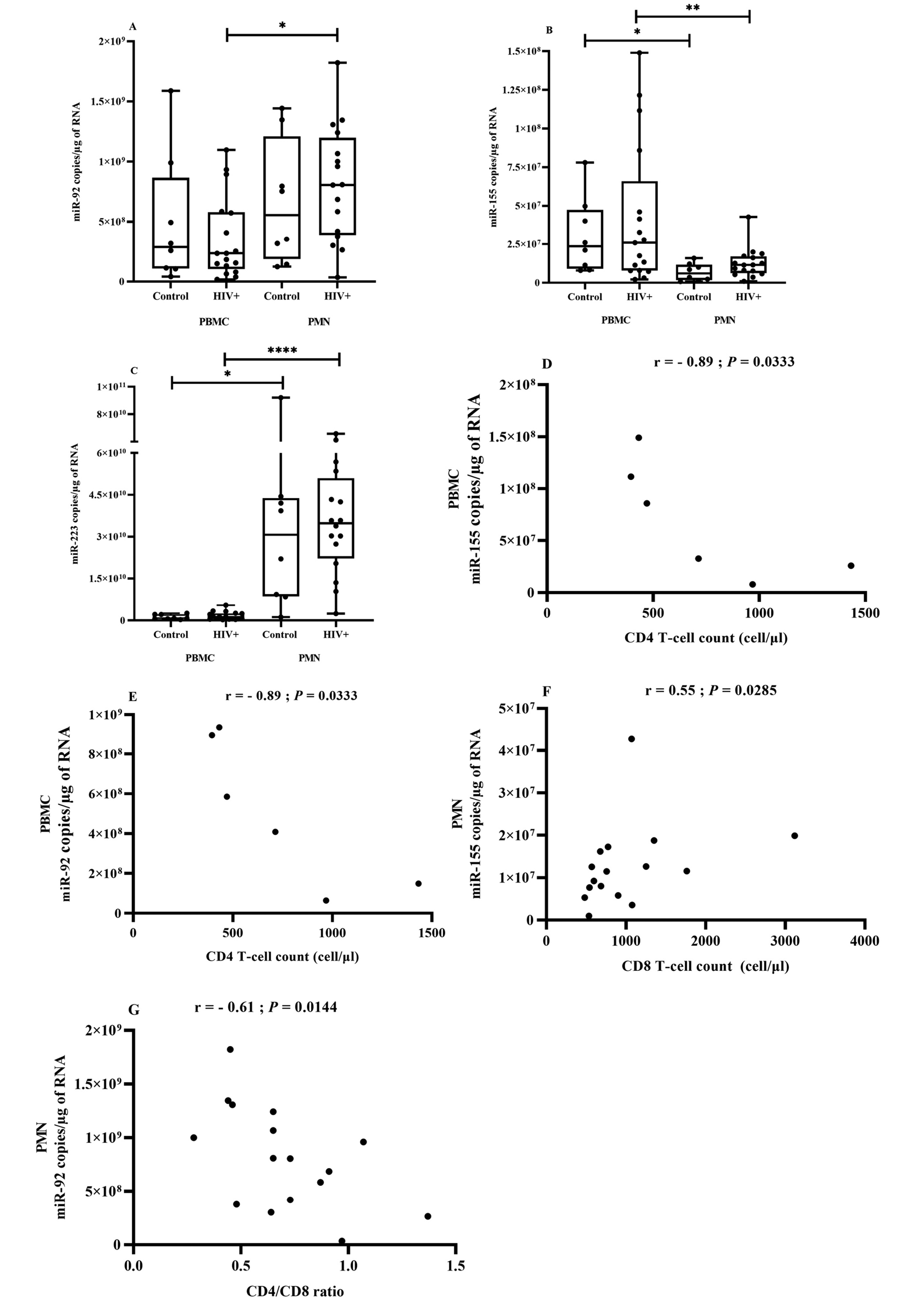 Keywords: biomarkers, HIV-1, extracellular vesicles, immune activation, inflammation, CD4/CD8 ratio, microRNA, miR-92, miR-155, miR-223.