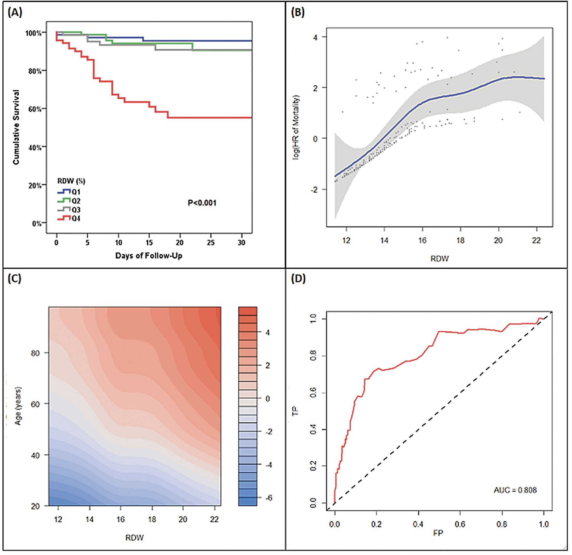 (A) unadjusted Kaplan-Meier curves, (B) unadjusted Cox regression model with RDW modelled using a penalized smoothed spline, (C) penalized-smoothed spline modelled age and RDW (color code represents log (Hazard Ratio) of mortality). Red demonstrates higher hazards of mortality and blue demonstrates lower hazards of mortality. This is modelled by age and RDW showing that 2% increase in RDW is equivalent to 10 year age increase with respect to mortality (D) Receiver Operating Characteristic curve for RDW to predict 30-day mortality (using Kaplan-Meier method)
