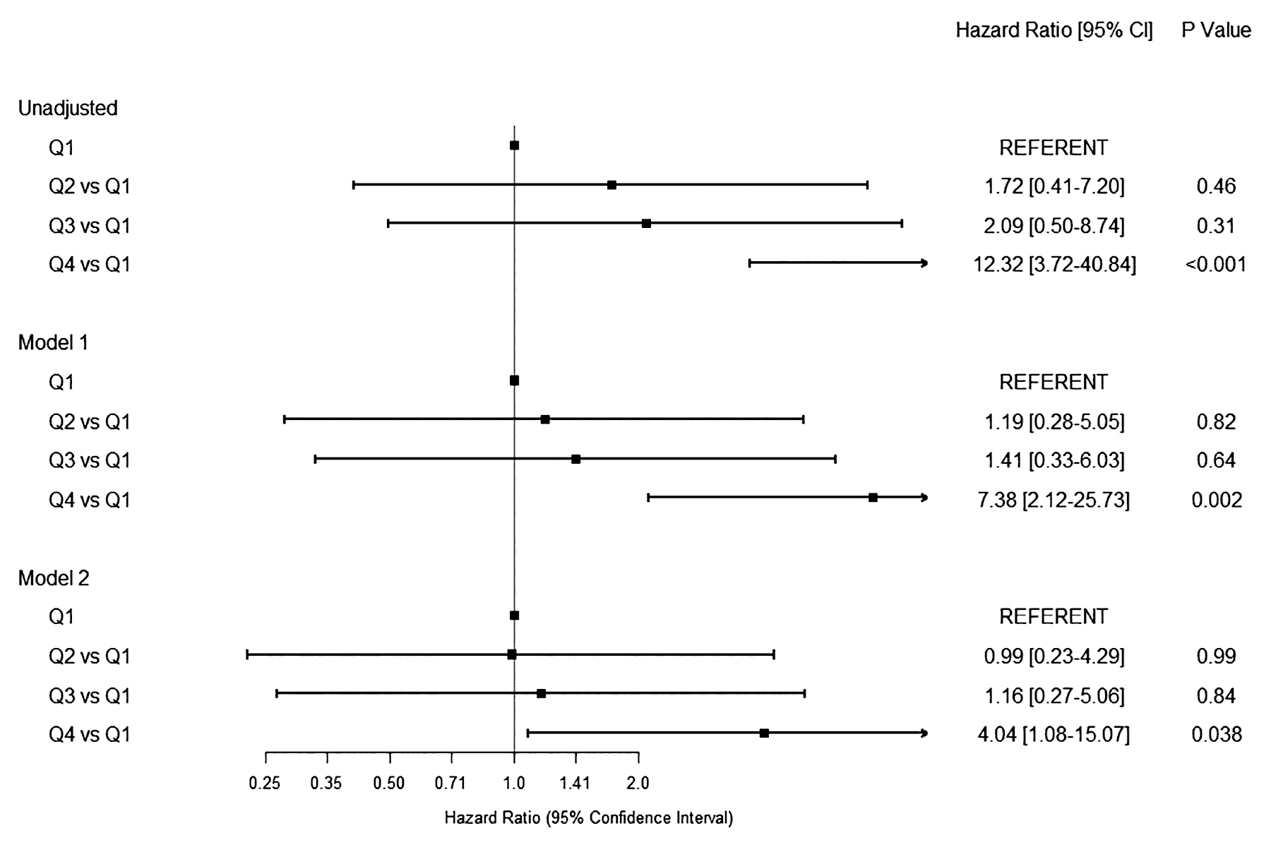 Compared with Q1, patients in Q4 had an increased risk of mortality (Hazard Ratio 12.32 [3.72-40.84], P<0.001) without significant attenuation after adjusting for age, sex, and race in model 1 (HR 7.38 [2.12-25.73], P=0.002), or further adjustment for hemoglobin and cardiovascular disease in model 2 (HR 4.04 [1.08-15.07], P=0.038). Figure 2 shows a forest plot of these hazards by quartile of RDW.