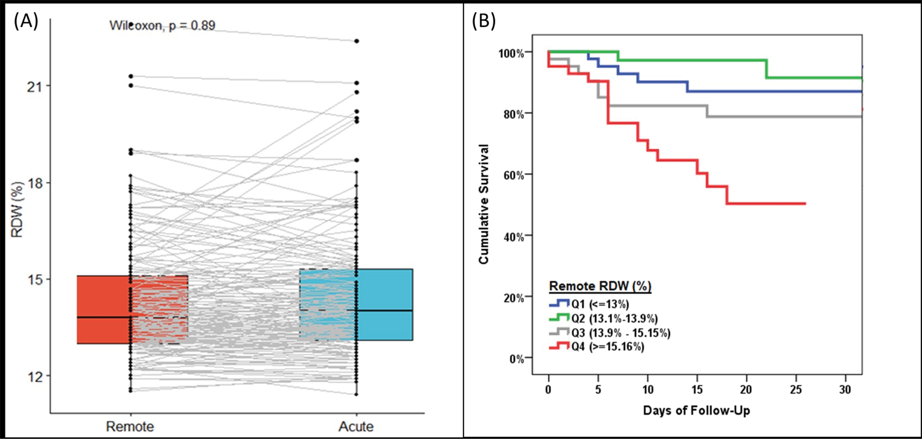 Subgroup analysis of patients with remote RDW: Of the 282 patients included in this study, 168 patients additionally had remote RDW (value measured between 7 days and 6 months prior to presentation) and acute RDW (value measured <7 days from time of COVID-19 diagnosis). There was no difference in RDW between remote values vs acute RDW: 13.6% [12.8-14.6] vs 13.9% [13.0-15.2], P=0.89 (figure 3A). Remote pre-COVID-19 RDW was also associated with post-COVID-19 mortality in an unadjusted model (HR 1.26 [1.11-1.44] per 1%, P=0.001), model 1 (HR 1.38 [1.17-1.62] per 1%, P<0.001), and model 2 (HR 1.26 [1.05-1.50] per 1%, P=0.011). Figure 3B shows the Kaplan-Meier survival curves by quartile of remote RDW.