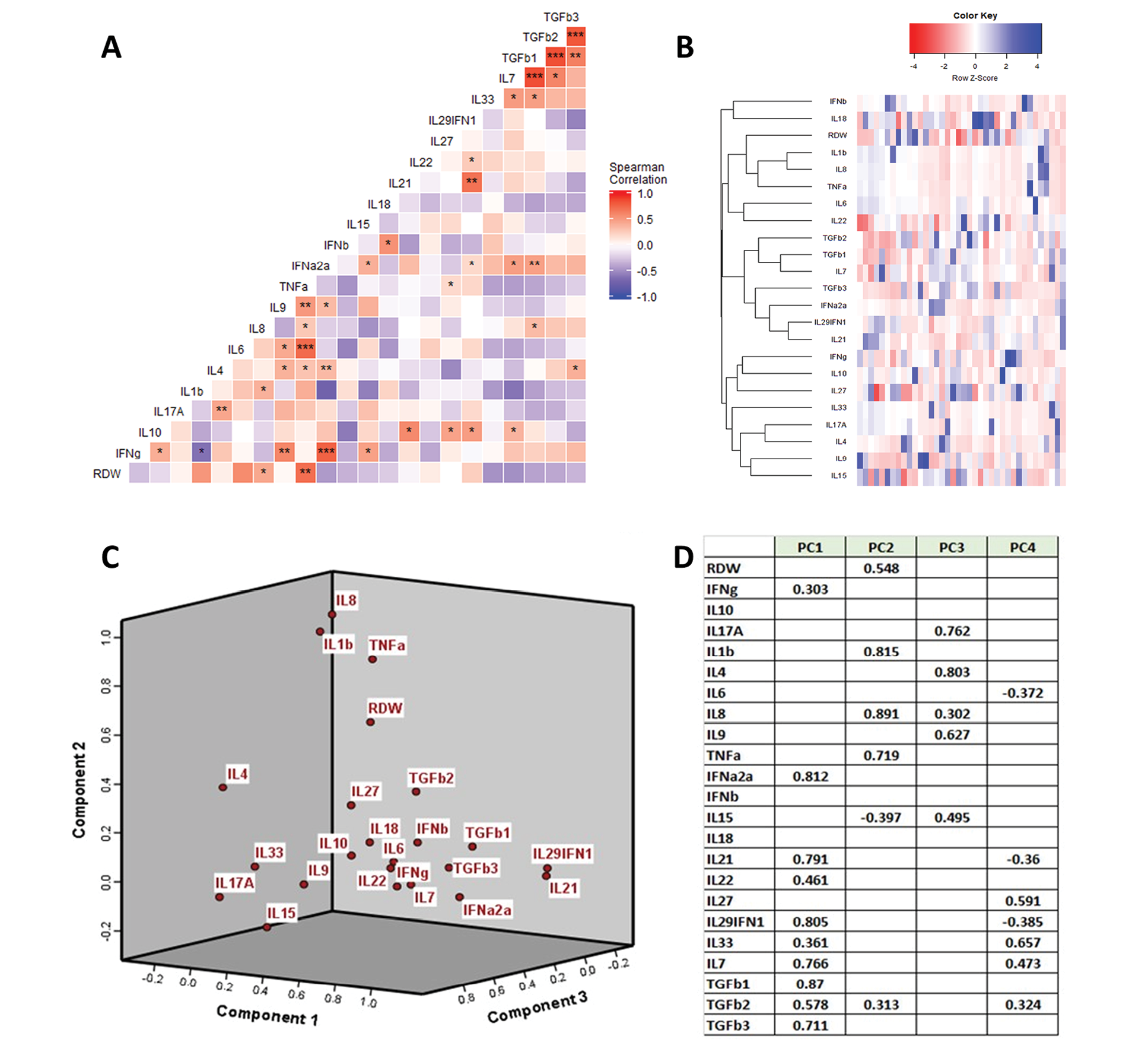 (A) correlation matrix between RDW and cytokine profile (Spearman correlations: *P<0.05, **P<0.01), (B) hierarchical clustering showing that RDW clusters with IL1-beta, IL-6, and TNF-alpha, (C) Component plot showing that RDW clusters with TNF-alpha and IL1-beta, (D) Principal Component Analyses showing that RDW clusters with IL-1beta, TNF-alpha, and IL-8