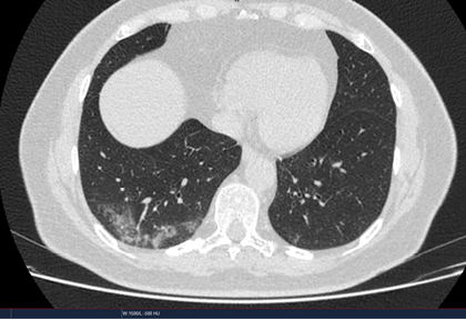 Scoring method: Mild (CT-1)—no more than three ground-glass opacities of <3 cm maximum diameter. Moderate (CT-2)—more than three ground-glass opacities; less than 50% involvement by visual assessment. Medium-heavy (CT-3)—ground-glass opacities and pulmonary consolidation; 50-70% involvement by visual assessment. Severe (CT-4)—diffuse ground-glass opacities with or without consolidation; more than 75% involvement by visual assessment.
