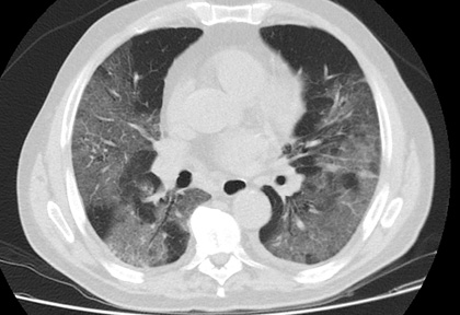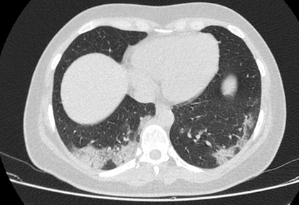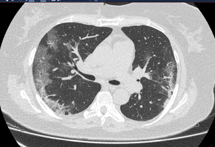 Routine clinical laboratory assays were performed in the hospital’s clinical laboratories. Clinical and laboratory information was extracted from the patients’ medical records. C reactive protein (CRP) in plasma was measured by immunoturbidimetry (Beckman Coulter, Krefeld, Germany). Interleukin-6 (IL-6) levels in plasma were measured by electrochemiluminescence (Siemens Medical Solutions Diagnostics, Siemens Healthcare, Erlangen, Germany). CT scans were read by experienced radiologists who scored results by severity using the criteria shown in Figure 1.