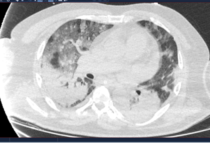**CT Scores that were more severe in the MV group than in the non-mechanical ventilation group (median 3(IQR 3-4) vs median 2(IQR 2-3, p=0.01 Mann-Whitney U test).