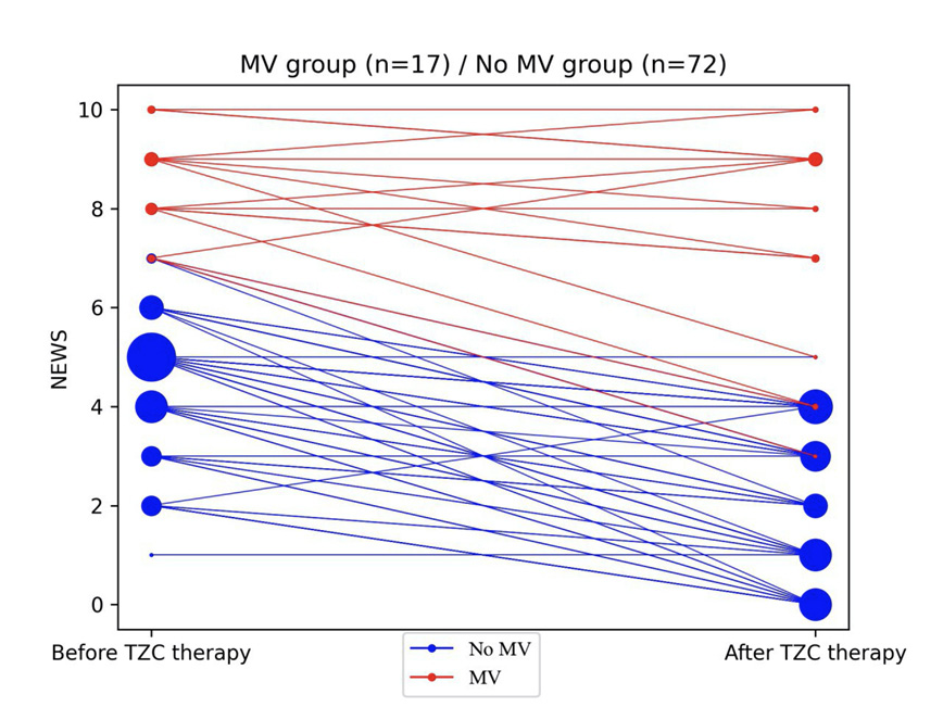 NEWS2 severity score is shown before (day of TCZ initiation) and 24-48 h after launching TCZ therapy for 17 patients who were receiving mechanical ventilation (MV) (red) or who were not receiving mechanical ventilation (blue) prior to therapy. The size of the circle reflects the number of patients with a given severity score.