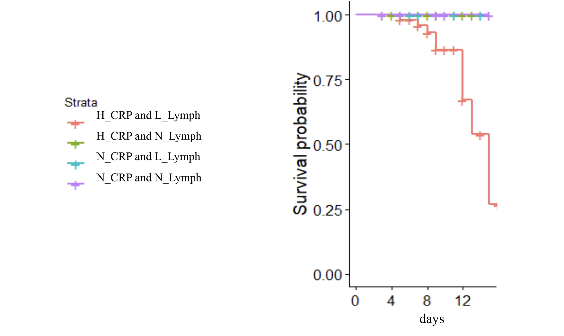 Highest and lowest CRP levels were >30 and <30 mg/L respectively. Normal and low lymphocyte counts were >1000 and <1000 cells/uL respectively. There were 41 patients in the highest CRP/low lymphocyte count group (red); 22 patients in the highest CRP/normal lymphocyte count group (green); five patients in the lower CRP/low lymphocyte group (blue); and six patients in the lower CRP/normal lymphocyte count group (purple).