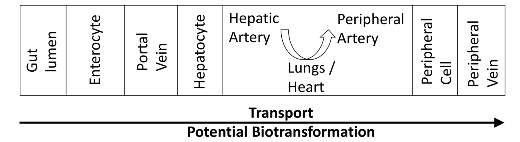 Figure 2. In order for a chemical from the gut lumen to reach a peripheral vein and become available for conventional blood sampling, it must be transported through multiple cells and compartments within which it is vulnerable to biotransformation.