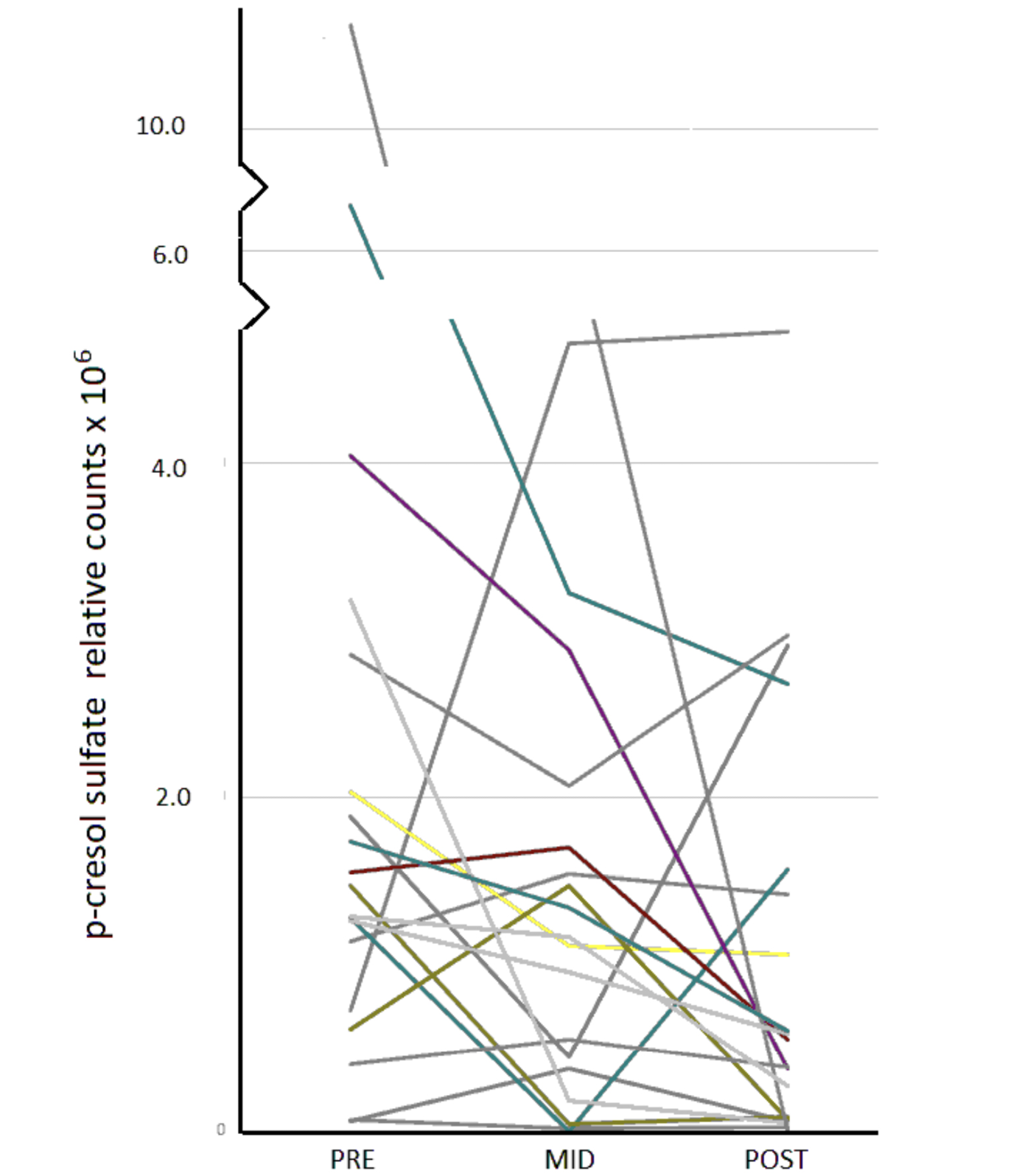 Figure 1. Serum levels of p-cresol sulfate immediately before (PRE), during (MID), and within 24h of completion (POST) of a course of broad-spectrum antibiotics.