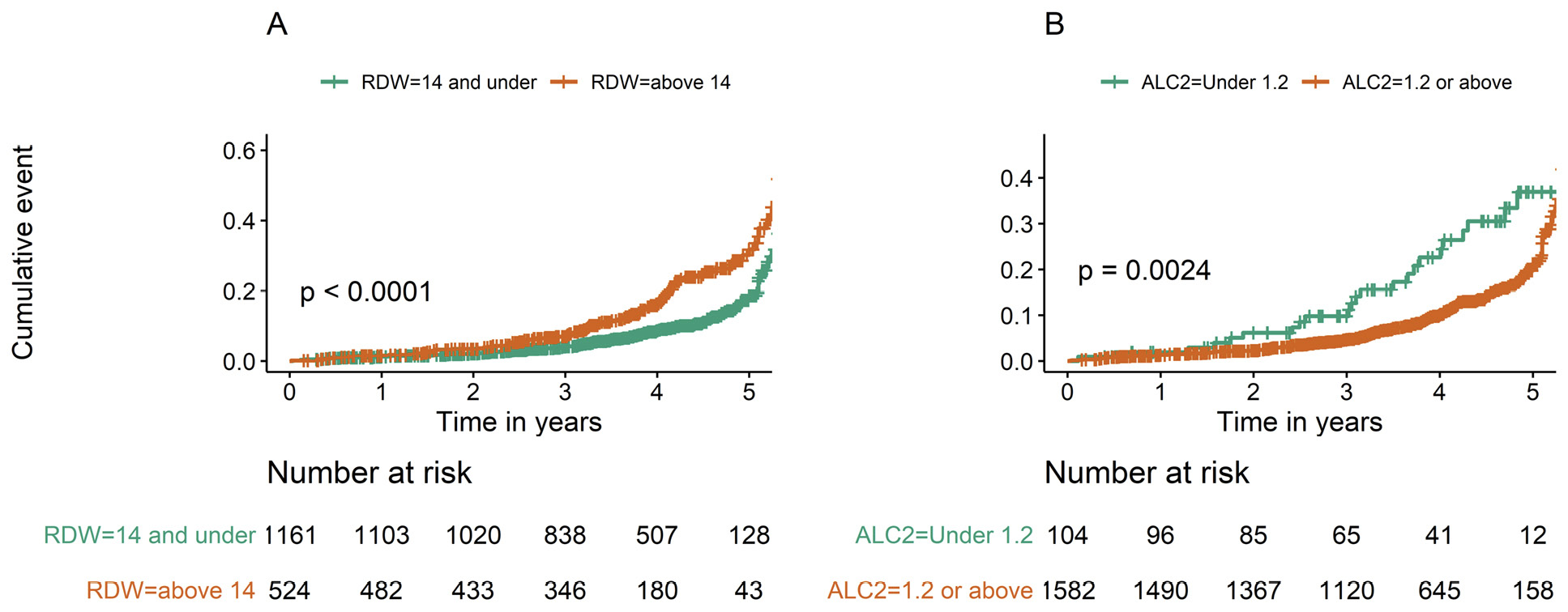 In this study, the ALC and RDW are each age related, and thus lymphopenia and anisocytosis may be markers of accelerated immunologic aging. However, we find that RDW and ALC do not correlate with each other and the associated risk for all-cause mortality of each marker is independent of each other. Anisocytosis is associated with clinically derived ASCVD risk and is related to anemia and hypo-albuminemia [10] [22].