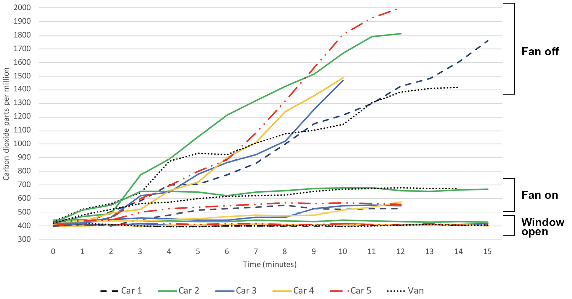 The drivers were asked to obtain carbon dioxide readings with the vehicle parked under different ventilation conditions. The ventilation conditions included fan off and windows closed, fan on and windows closed, and fan off and 1 front window fully opened. In preliminary experiments in 1 vehicle, the increase in carbon dioxide levels inside the vehicle was equivalent to the increase observed in a non-ventilated 41.7 m3 room (ie, >2,000 ppm within 15 minutes).