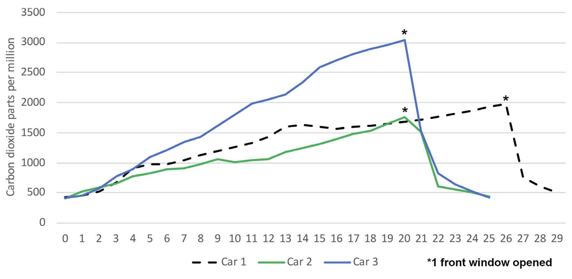 Conclusion: Carbon dioxide measurements could provide a practical and rapid method to assess ventilation in motor vehicles. Simple measures such as opening windows, turning on the fan, and avoiding the recirculation mode greatly improve ventilation.