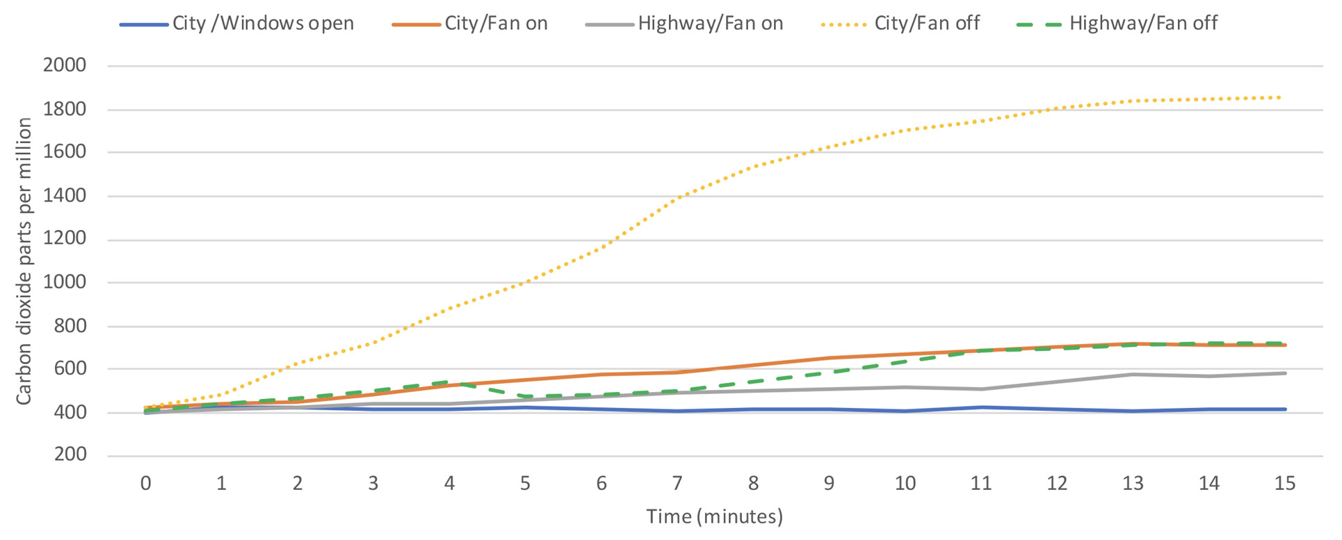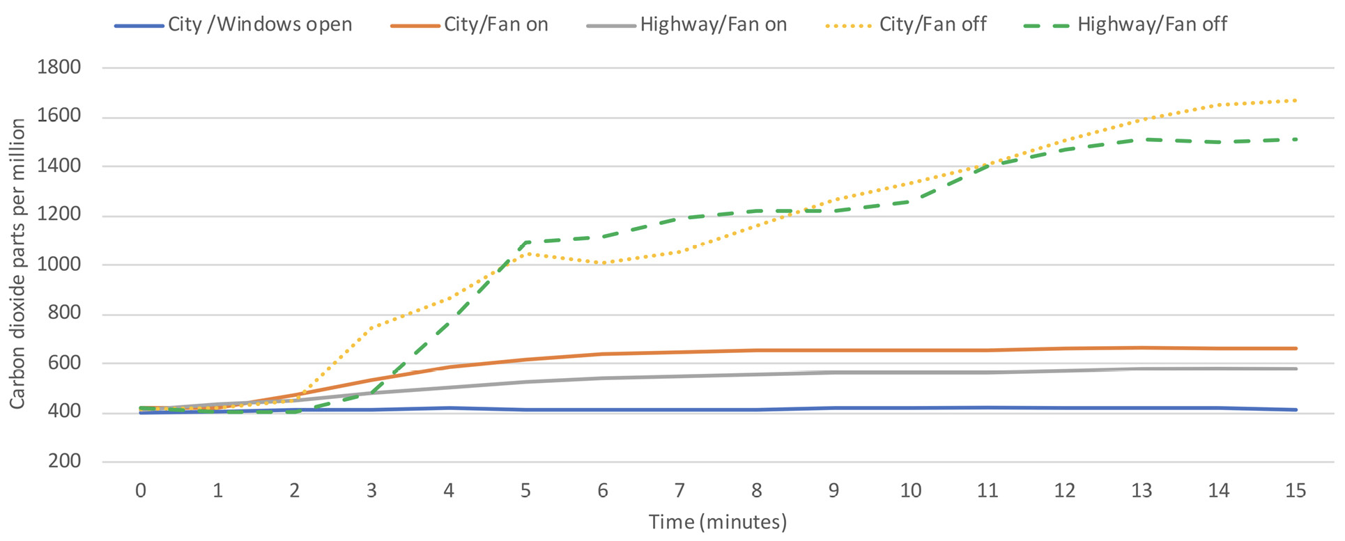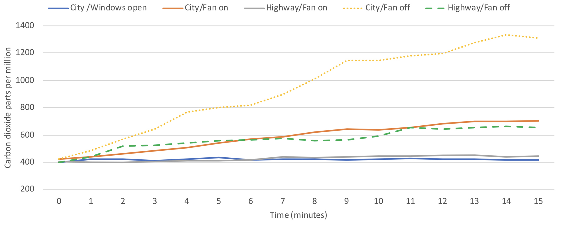Results: Carbon dioxide levels remained below 800 ppm in all vehicles if the ventilation fan was on and/or the windows were open while parked or during city or highway driving. With the ventilation system set on non-recirculation mode, carbon dioxide levels rose above 800 ppm in all vehicles when the fan was off and the windows were closed while parked and during city driving, and in 2 of the 6 vehicles during highway driving. With the ventilation system set on recirculation mode, carbon dioxide rose above 800 ppm within 10 minutes in all vehicles tested.