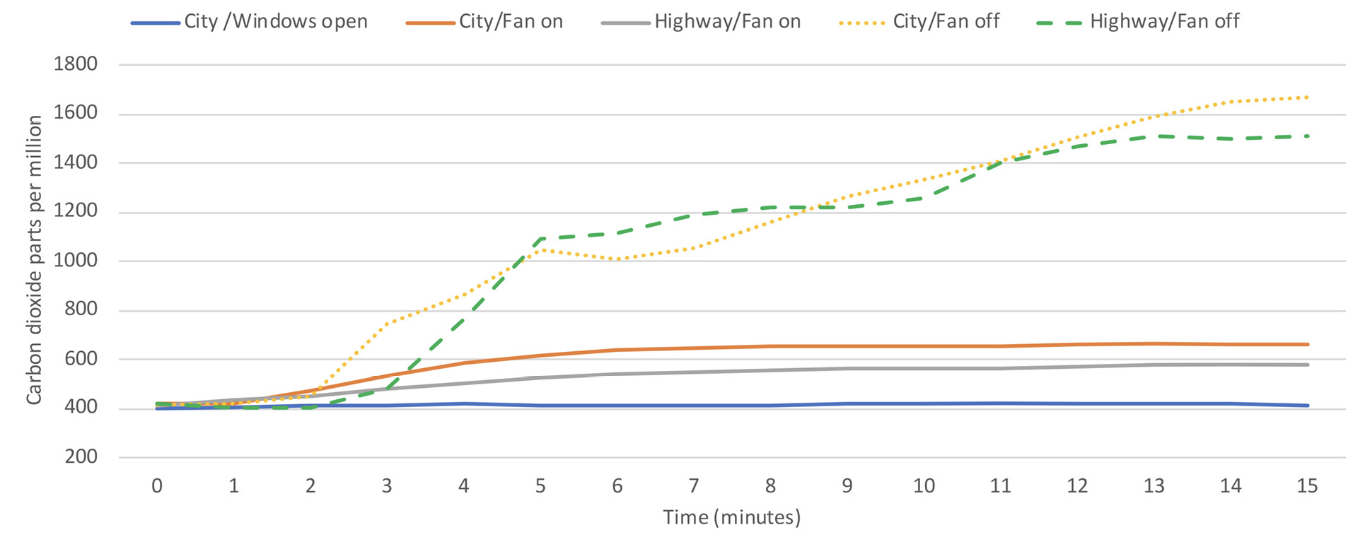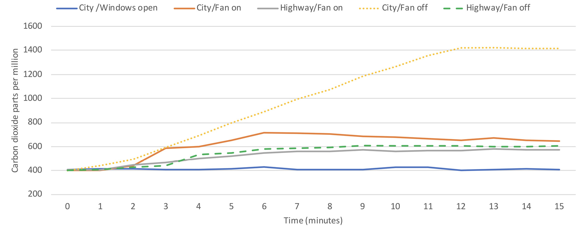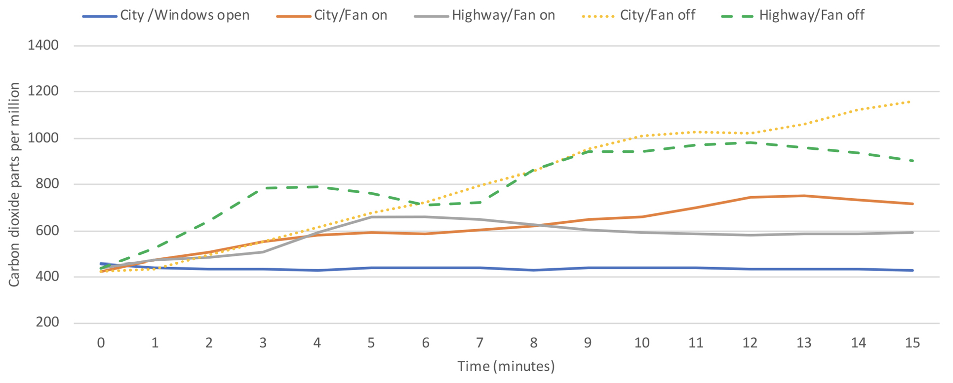 Results: Carbon dioxide levels remained below 800 ppm in all vehicles if the ventilation fan was on and/or the windows were open while parked or during city or highway driving. With the ventilation system set on non-recirculation mode, carbon dioxide levels rose above 800 ppm in all vehicles when the fan was off and the windows were closed while parked and during city driving, and in 2 of the 6 vehicles during highway driving. With the ventilation system set on recirculation mode, carbon dioxide rose above 800 ppm within 10 minutes in all vehicles tested.