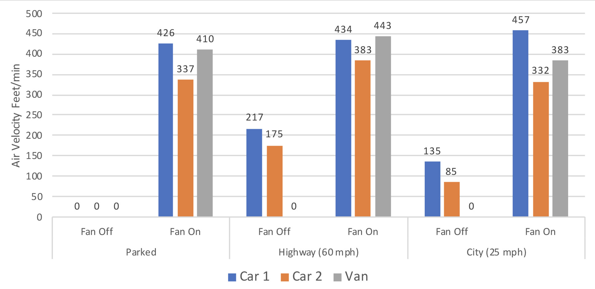 We found that carbon dioxide levels under differing ventilation conditions correlated well with measurement of airflow from vents allowing air entry for 3 vehicles where airflow was assessed (2 cars and the van). When the vehicles were parked with the fan off no airflow was detected from the vents and carbon dioxide levels rose. In contrast, when the fan was on while parked or when driving, high airflow (>300 feet/min) was detected, and carbon dioxide levels remained low. More modest airflow was detected during highway driving with the fan off in both cars (>175 feet/min), but no airflow was detected under these conditions in the van; peak carbon dioxide levels were below 1,000 ppm in both cars, whereas the carbon dioxide level increased to nearly 1,500 ppm in the van. Even lower levels of airflow were detected in the cars during city driving at 25 miles per hour with the fan off (<135 feet/min), and no airflow was detected when the cars were stopped at stop signs/traffic lights; during city driving carbon dioxide levels peaked above 1,100 ppm.
