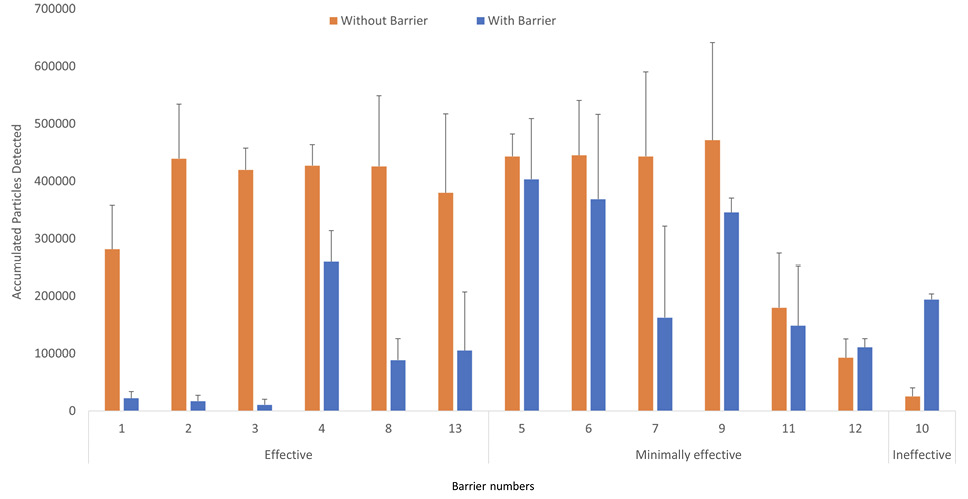 Figure 1. Accumulated number of 5% sodium chloride aerosol particles detected over 2 minutes with versus without a plexiglass barrier in place. The aerosol particles were released at 91 cm from the barrier. Average results for 3 experiments are shown. Error bars represent standard error. Effective barriers significantly reduced particle exposure; minimally effective barriers reduced exposure but not significantly; the ineffective barrier resulted in a significant increase in exposure.