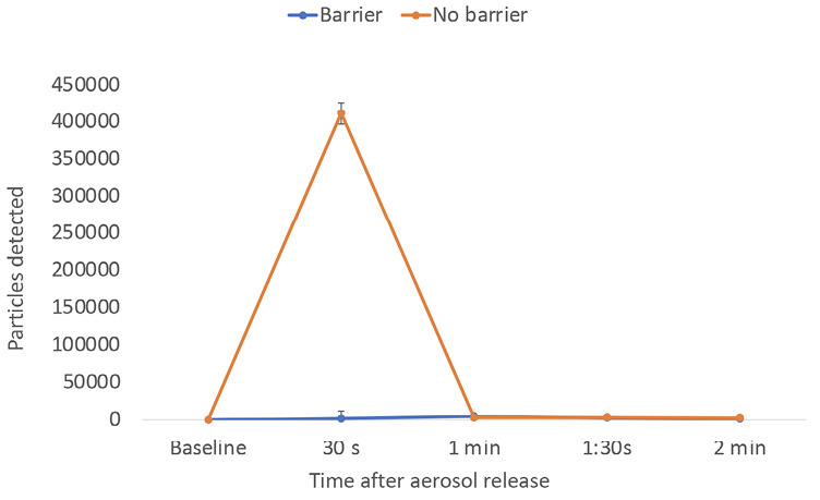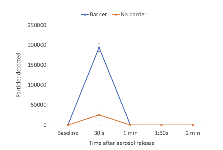 Figure 5. Detection of 5% sodium chloride aerosol particles behind a plexiglass barrier over 30 minutes after release with versus without a plexiglass barrier in place in a non-ventilated room. The aerosol particles were released at 91 cm from the barrier. Average results for 3 experiments are shown. Error bars represent standard error.