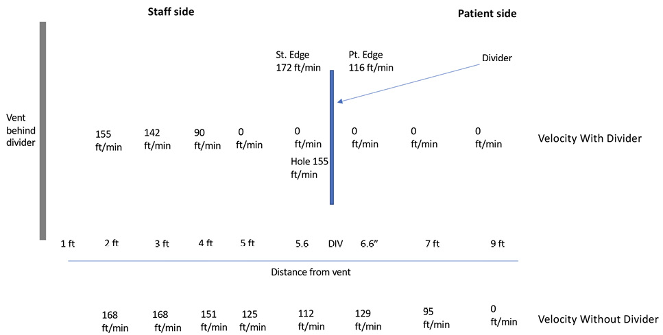 Workers in healthcare and non-healthcare settings are at risk of acquiring infection with severe acute respiratory syndrome coronavirus 2 (SARS-CoV-2) and other respiratory viruses [1–5]. In work situations where physical distancing cannot be maintained, barriers are often installed to reduce the risk for viral transmission [6–8]. In laboratory-based testing, some types of barriers have been shown to reduce exposure to aerosols [9, 10]. For example, we found that solid physical barriers were effective in reducing contamination with an aerosolized benign virus, water soluble dye, or fluorescent microspheres in laboratory simulations, but openings in the barriers resulted in loss of efficacy [9]. However, there is concern that barriers that are not carefully installed have the potential to hinder good ventilation resulting in increased aerosol exposure [1, 6]. To reduce the risk that barriers might hinder ventilation, the Centers for Disease Control and Prevention (CDC) recommends that airflow distribution testing with tracer “smoke” or handheld fog generators should be conducted [1]. It is suggested that if such testing identifies stagnant air pockets, the barrier should be redesigned or reoriented [1].