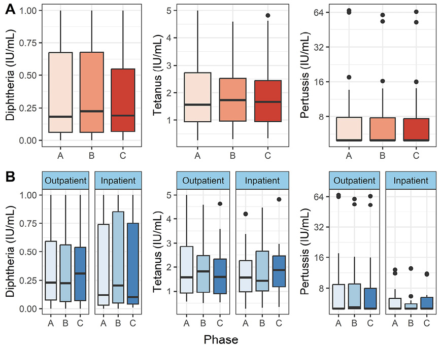 Figure 1. Diphtheria, tetanus, and pertussis toxoid antibodies in peripheral blood. Vertical lines denote the range of minimum and maximum values, the box denotes 1st and 3rd quartile values, and the middle horizontal line denotes the median value. Black dots denote outlier values. A = acute (n = 55), B = convalescent (n = 50), C = recovered (n = 48). Figure 1A shows the distributions in all patients, and 1B shows outpatients and hospitalized patients separately.