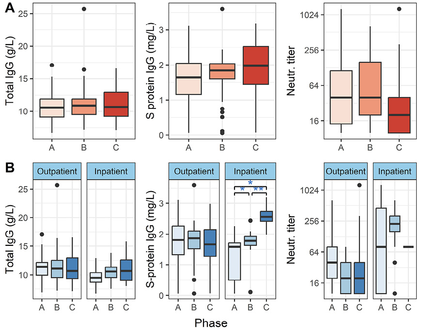 Figure 2. Total IgG, SARS-CoV-2 Spike protein IgG, and SARS-CoV-2 neutralizing antibody titers in peripheral blood. Vertical lines denote the range of minimum and maximum values, the box denotes 1st and 3rd quartile values, and the middle horizontal line denotes the median value. Black dots denote outlier values. A = acute, B = convalescent, C = recovered. Significance: * P< 0.05, ** P < 0.01 (paired Wilcoxon test). Figure 1A shows the distributions in all patients, and 1B shows outpatients and inpatients separately.