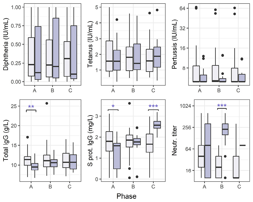 To test our main hypothesis of COVID-19-induced immunological amnesia, we analyzed antibodies against diphtheria, tetanus, and pertussis toxoid/toxin. Figure 1 shows an overview of the results. We found no statistically significant differences between the disease phases in either the entire patient population (P > 0.05, Friedman test) or only in the inpatients (P > 0.05, paired Wilcoxon test).