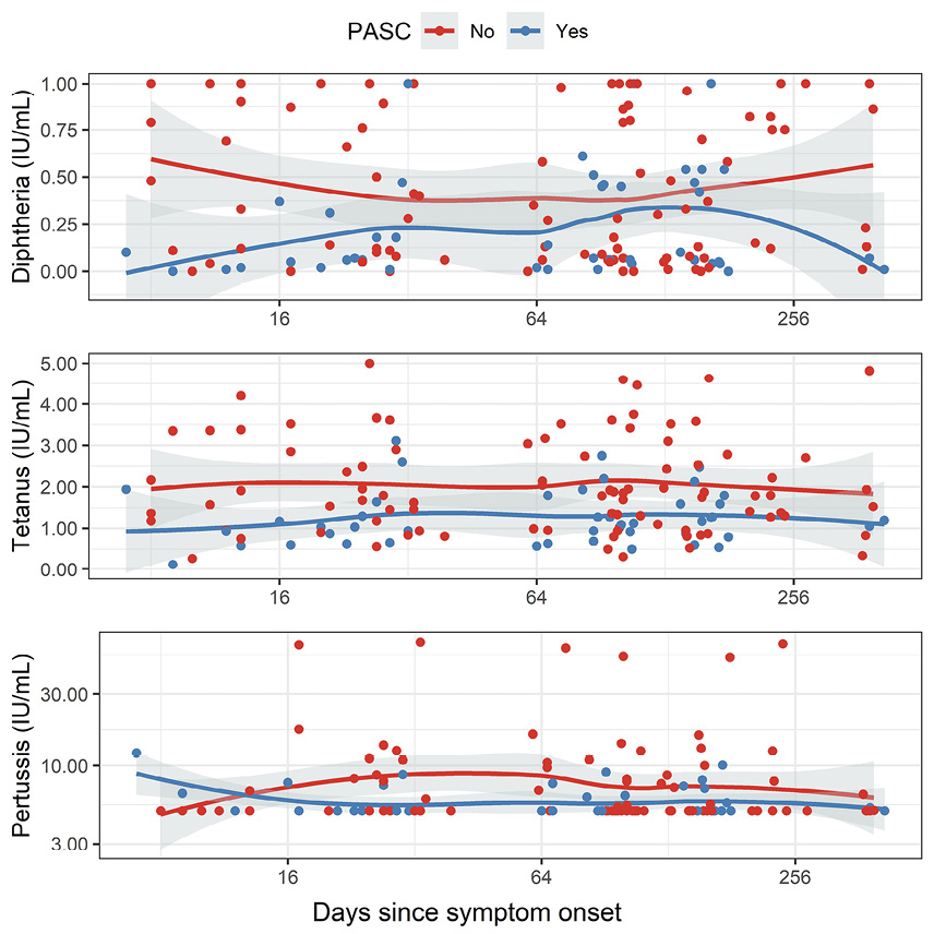Methods: We recruited COVID-19 patients (n = 59) in Helsinki, Finland, and collected plasma samples on 2 to 3 occasions during and after infection. We measured IgG antibodies to diphtheria toxin, tetanus toxoid, and pertussis toxin, along with total IgG, SARS-CoV-2 spike protein IgG, and neutralizing antibodies. We also surveyed the participants for up to 17 months for long-term impaired olfaction as a proxy for prolonged post-acute COVID-19 symptoms.