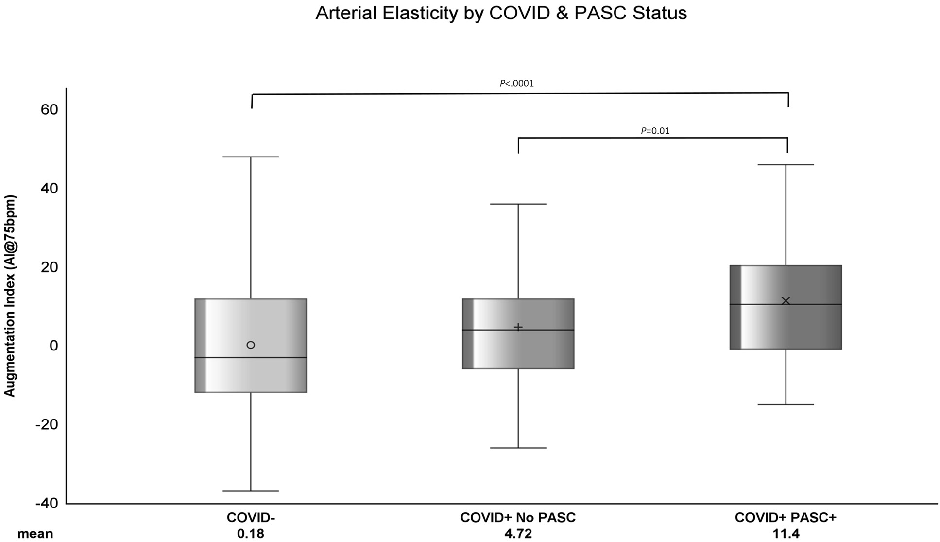 The augmentation index is a valid measure of arterial elasticity [27] and has been shown to correlate with cardiovascular risk [28]. However, despite its reliability and reproducibility [29], it could be influenced by physiologic changes (heart rate and vasomotor tone) at the time of the measurement [30]. In our study, we used strict criteria to minimize these potential physiologic confounders that included fasting state, lack of smoking, exercise, and no medications for at least 4 hours before the measures, and standardization of room temperature. Overall, we observed that COVID+ PASC+ patients had high mean AI, indicating arterial stiffness, and that those suffering from cardiopulmonary and/or neurocognitive phenotypes had the worst arterial elasticity. Future studies are needed to continue to investigate the underlining pathophysiology of PASC as well as the longer-term longitudinal follow up of these measures and their clinical consequences.