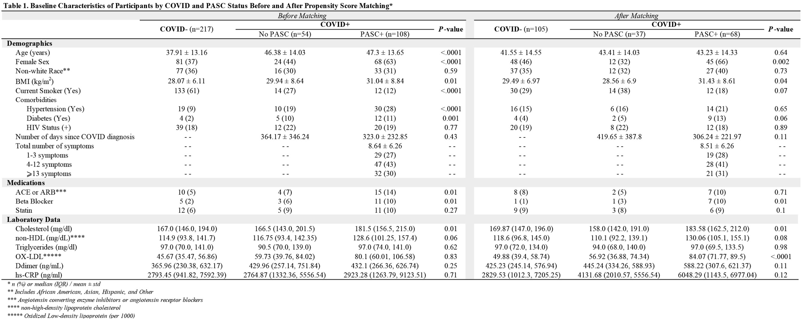 METHODS: Data was collected from a prospectively enrolled cohort (n=379) of COVID-negative and COVID-positive participants with and without PASC. Primary outcomes, endothelial function (measured by reactive hyperemic index [RHI]), and arterial elasticity (measured by augmentation index standardized at 75 bpm [AI]), were measured using the FDA approved EndoPAT. Patient characteristics, labs, metabolic measures, markers of inflammation, and oxidized LDL (ox-LDL) were collected at each study visit, and PASC symptoms were categorized into 3 non-exclusive phenotypes: cardiopulmonary, neurocognitive, and general. COVID-negative controls were propensity score matched to COVID-negative-infected cases using the greedy nearest neighbor method.