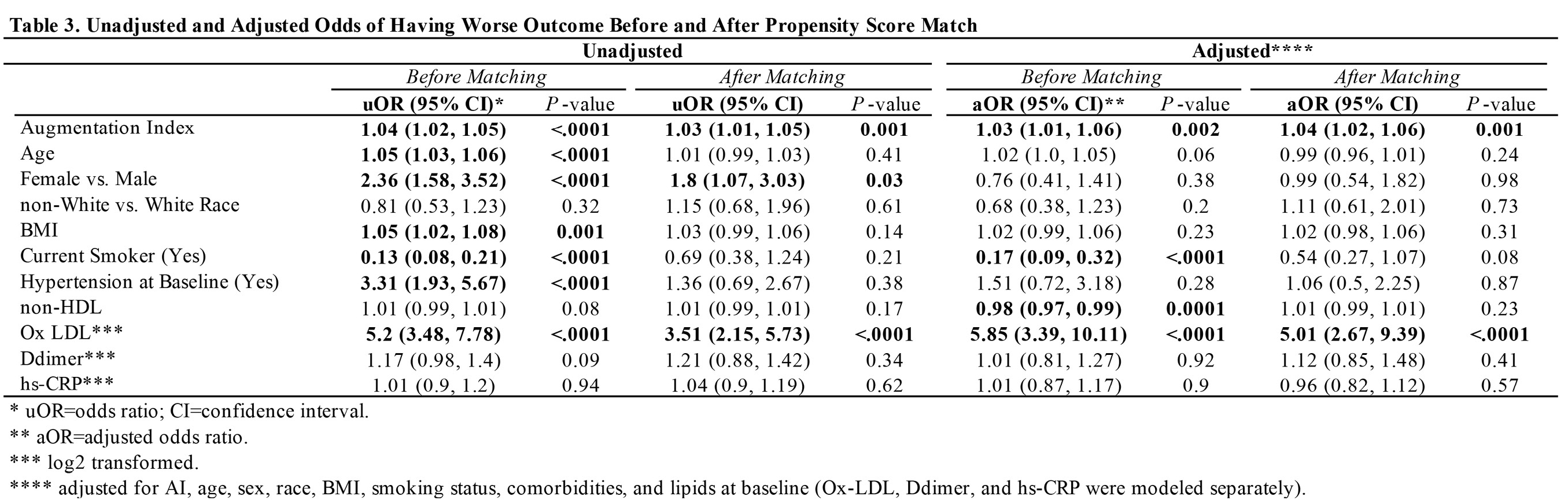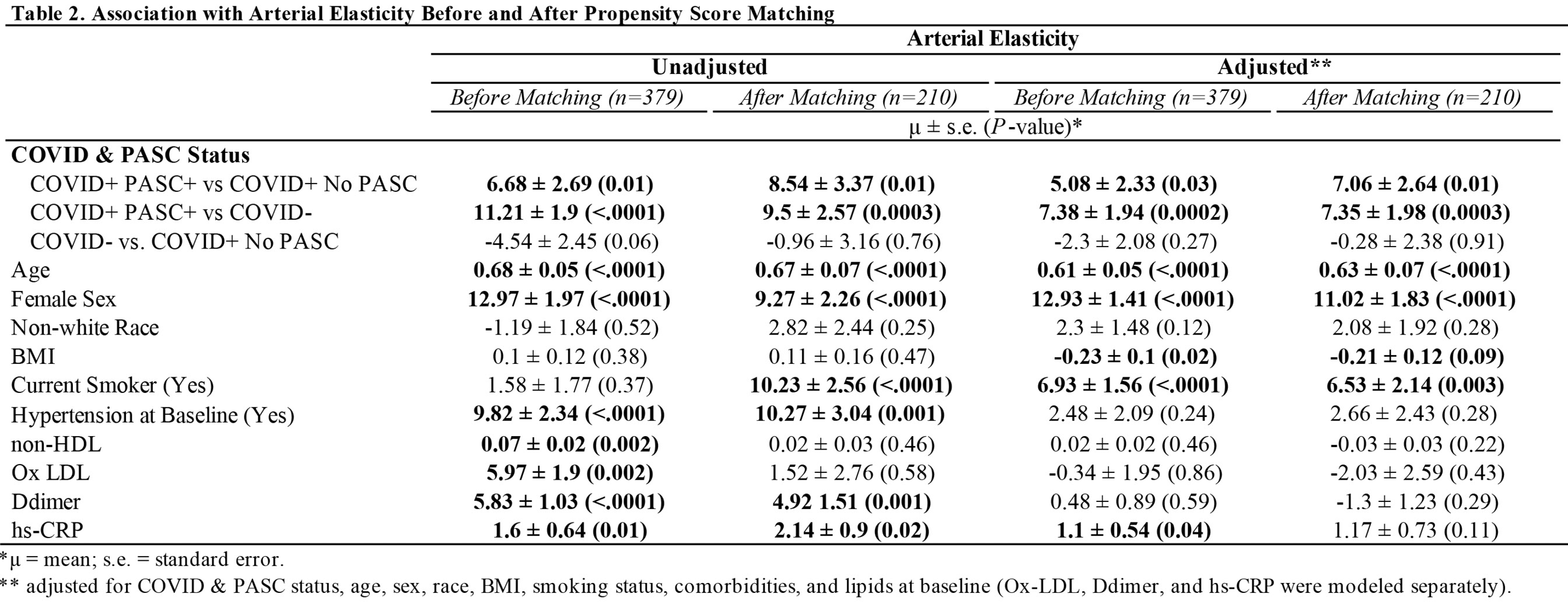Propensity scores matched sample selected 105 COVID- and 105 COVID+ participants. As shown in Table 1, there was not enough evidence to suggest any difference in baseline age, race, smoking status, or comorbidities. In Table 2 adjusted models, COVID+ PASC+ had 7.06 ± 2.64 (P=0.01) higher AI compared to COVID+ No PASC and 7.35 ± 1.98 (P=0.0003) higher AI than COVID-, also female sex had 11.02 ± 1.83 (P<0.0001) higher AI compared to male sex. In contrast, BMI, smoking, hypertension, lipid levels, and inflammation markers were not associated with AI. In Table 3, AI (aOR, 1.04; 95% CI, 1.02, 1.06) and oxidized LDL (aOR, 5.01; 95% CI, 2.67, 9.39) were positively associated with having PASC.