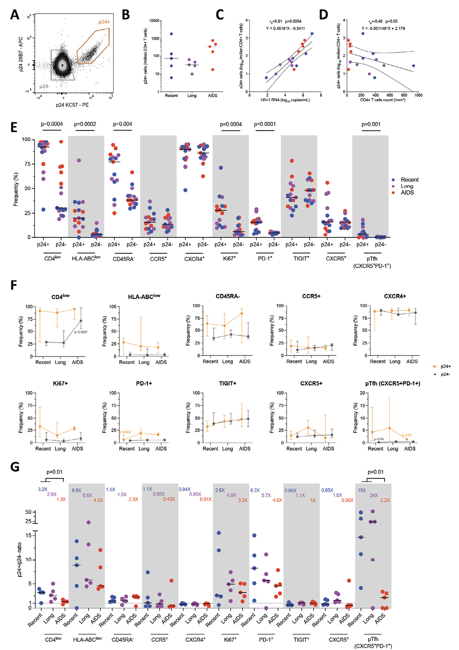 To ensure that these minor variations were explicitly attributable to p24+ cells, we then calculated the ratio of each marker’s expression between p24+ and p24- cells (Figure 1G). Ratios varied widely according to markers and stages (from 0.43X to 24X). The highest enrichment ratios were observed for pTfh and were significantly higher in combined recent and long-term infections compared to AIDS (15X, 24X, and 2.2X, respectively; Mann-Whitney, P=0.01). Moreover, the enrichment ratios of HLA-ABClow (8.8-4.5X) and PD-1+ (8.2-4.6X) were also high but not significant between the stages. The enrichment ratios of CD45RA- (1.5-2.3X) and Ki67+ (2.6-3.2X) were lower and were not significant either between the stages. Expectedly, the enrichment of CD4low was higher in recent and long-term infections when compared to AIDS (3.2X, 2.6X, and 1.3X, respectively, P=0.01). Altogether, this shows that enrichment factors vary throughout the infection independently of the frequency of target cells.