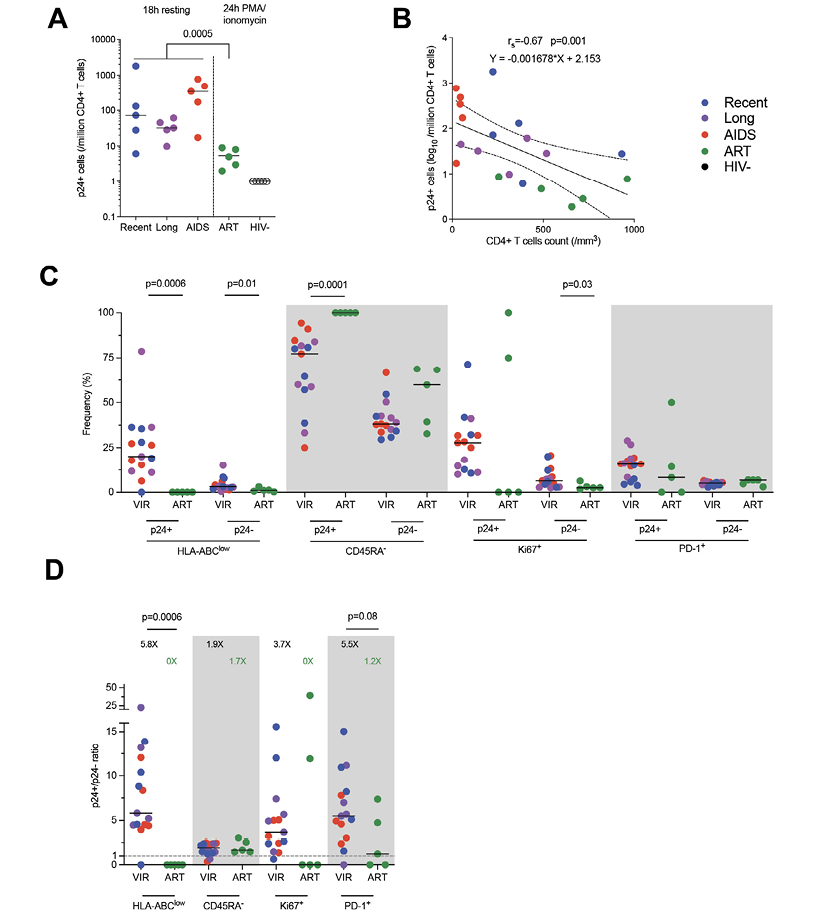 Dual recognition by both p24 antibodies defined infected p24+ cells (Supplemental Figure 1B) and allowed for analysis of their phenotype (Supplemental Figure 1C). In samples from viremic participants, p24+ cells revealed after the 18 hours of resting were defined as productively infected cells. In samples from ART-treated participants, p24+ cells revealed after the 24-hour stimulation were defined as latently infected cells (translation-competent HIV reservoir). An example of p24 expression dot plots is shown for each group of participants (HIV-, recent infection, long-term infection, AIDS, and ART) in Supplemental Figure 1D.