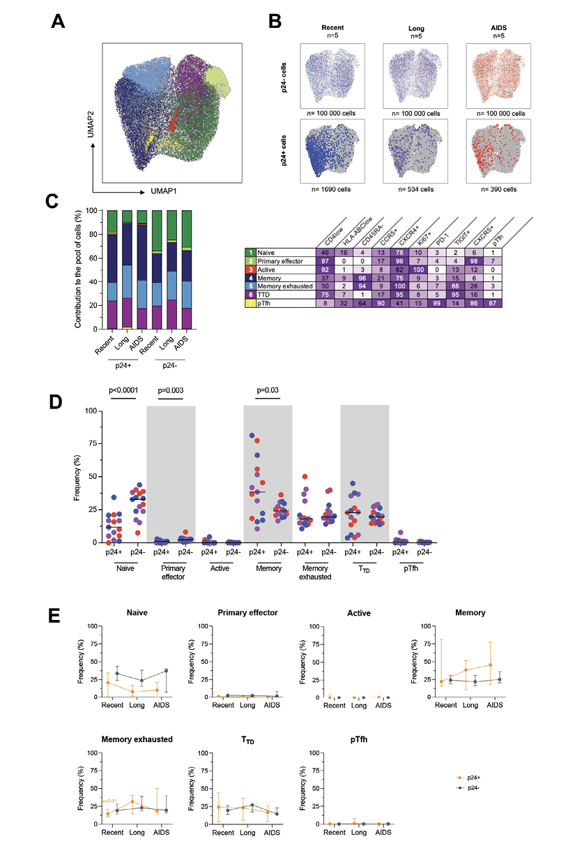 Next, we evaluated the markers that productively infected p24+ cells were co-expressing to assert more specifically their phenotype all along HIV infection. To this end, we realized a UMAP analysis on cells gathered from all the viremic participants. Since p24+ are not frequent, we gathered all of them from all participants (n=2614 p24+ cells). As for p24- cells, we downsampled 20,000 of them from every participant (n=300,000 p24- cells) to have the same amount for each of them. Cells were grouped in 7 clusters by the similarities of their markers’ expression (Figure 2A). We then revealed the p24+ and p24- cells distributed in these clusters (Figure 2B) and observed that these cells were well localized in given clusters. The clusters in which p24+ cells were found seemed to change between HIV stages. Thus, we calculated for each stage the frequencies of clusters in which p24+ and p24– cells were distributed and determined the phenotype of each cluster (Figure 2C). However, since the analysis was based on the expression of limited markers, the suspected phenotypes might be incomplete. Overall, the cells that mostly contributed to the total pool of cells were equally naïve (25.1%), memory (29.4%), memory exhausted (20.2%), and terminally differentiated T-like cells (TTD, 22.3%). With lower proportions, primary effector-like (2.43%), proliferative (0.18%), and pTfh-like cells (0.4%) also contributed to the total pool of cells. By comparing the frequency of each population between p24+ and p24- cells (Figure 2D), we showed that the frequency of naïve and primary effectors cells was significantly lower in p24+ cells when compared to p24- cells (Wilcoxon, P<0.0001 and P=0.003, respectively). Conversely, the frequency of memory cells was higher in p24+ cells when compared to p24- cells (P=0.03). We also sought to evaluate the variations of each population frequency between HIV stages in both p24+ and p24- cells (Figure 2E). No significant differences were observed for 2-by-2 comparisons. However, we only observed a trend toward a higher frequency of memory exhausted cells in recent infection compared to combined long-term infection and AIDS (P=0.07).