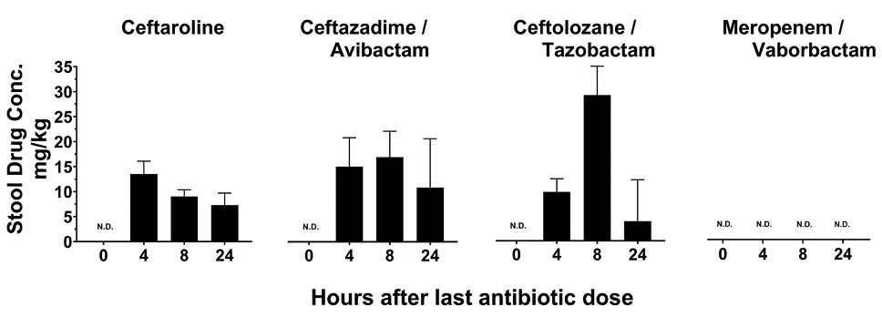 Figure 2 shows the concentrations of the test antibiotics in stool specimens collected 4, 8, and 24 hours after the third of 3 daily doses of the antibiotics at 5-times the usual human dose on a mg/kg basis. Treatment with ceftolozane/tazobactam, ceftaroline, and ceftazidime/avibactam resulted in detectable concentrations of the antibiotics in stool at 4, 8, and 24 hours after dosing. As noted previously, meropenem/vaborbactam was not detected in stool in 2 of the 3 experiments.