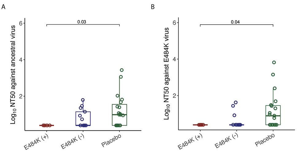 Figure 1. Comparison of log10 NT50 values in different study groups at study entry. (A) against ancestral virus, (B) against E484K virus. The boxplots represent the 25th and 75th percentiles (bottom and top edge of the box), while the open circles represent individual data point. Median values are represented by horizontal line within the boxplot. Comparison of NT50 values across study groups were compared using Wilcoxon rank sum test. P<0.05 were considered statistically significant.