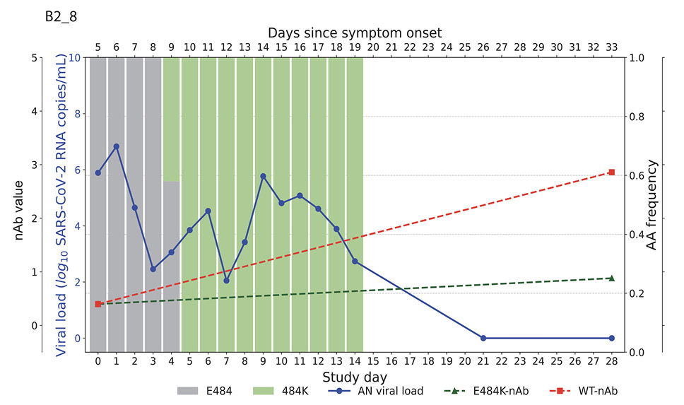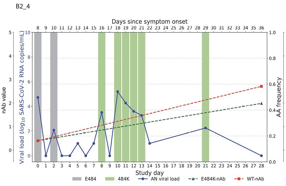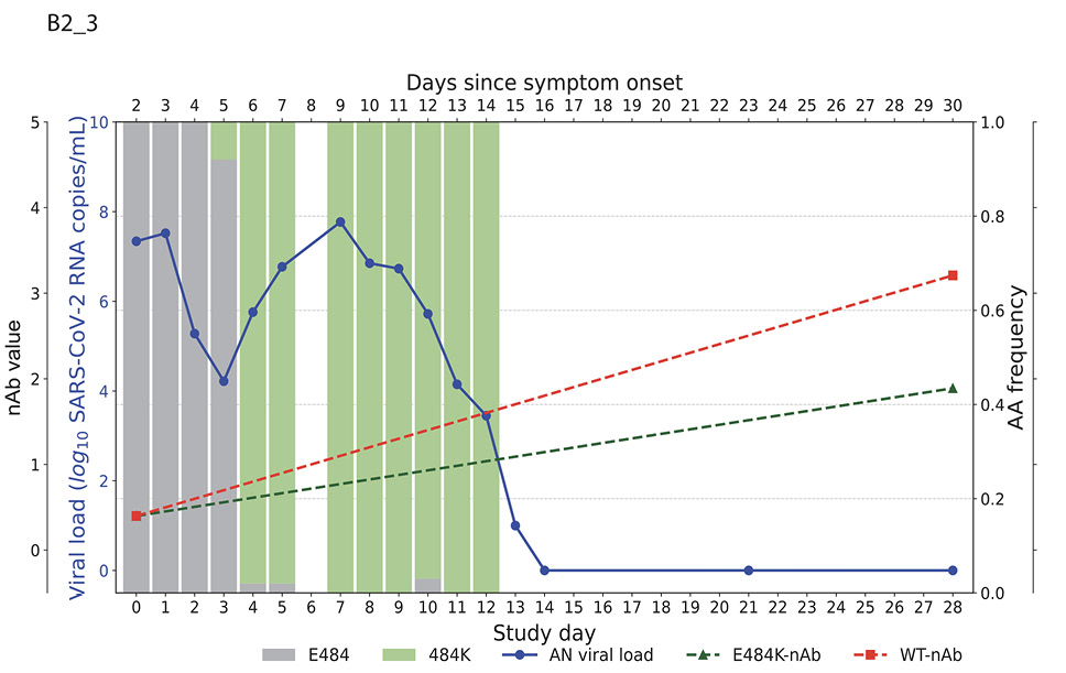 Higher baseline (pre-treatment) nAb titers against either ancestral or E484K virus was associated with lower baseline viral load (ancestral virus: Spearman r = -0.37, P=0.022; E484K-containing virus: r = -0.33, P=0.042; Supplemental Figure 1). The development of the resistance to bamlanivimab was associated with prolonged viral shedding [9] that was subsequently cleared in all 5 participants (Figure 2). The emergence of SARS-CoV-2 resistance mutations was closely linked to consistent changes in viral load dynamics. This is illustrated in Figure 2, which shows 5 examples (participants B2_3, B2_4, B2_6, B2_7, and B2_8) of viral rebound in participants with the appearance of escape variants. For instance, in participant B2_3, the E484K resistance mutation emerged on study day 3 as a low-frequency variant and quickly became the dominant strain by the following day (Figure 2, top left panel). This mutation was associated with a 3.6 log10 copies/mL increase in AN swab viral loads over the next 4 days, reaching a peak of 7.8 log10 copies/mL on study day 7 before declining. Similar trends were observed in participants B2_4, B2_6, B2_7, and B2_8. In all the cases, the emergence of bamlanivimab-specific resistance was linked to viral rebound, which was subsequently cleared by day 28 (Figure 2).