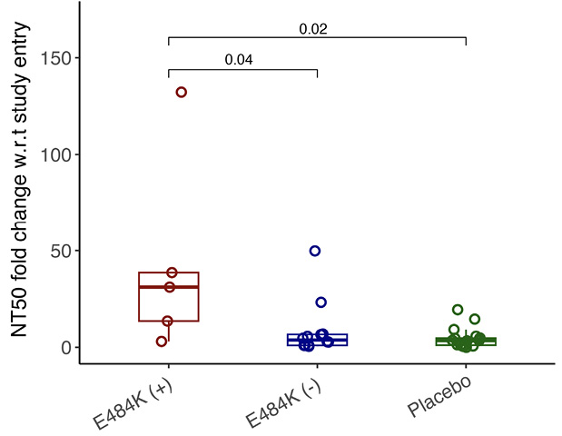 Figure 3. Comparison of NT50 fold change w.r.t. study entry against E484K virus in different study groups. Boxplot shows NT50 fold change at day 28 w.r.t. study entry in different study groups against E484K virus. The boxplots represent the 25th and 75th percentiles (bottom and top edge of the box), while the open circles represent individual data point. Median values are represented by horizontal line within the boxplot. Comparison of median values across study groups were compared using Wilcoxon rank sum test. P<0.05 were considered statistically significant.