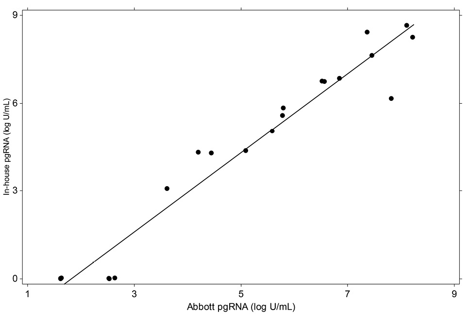 Prior to applying pgRNA test methods to the two primary sample cohorts, we performed paired correlation of the two pgRNA methodologies, utilizing a set of 20 samples available from the Hepatitis Research Group repository at the University of Cincinnati. This registry is an ongoing longitudinal collection of participants seen in healthcare settings at the medical center and includes individuals infected with HBV with or without HIV or HCV. These samples were collected from 16 male and 4 female patients with a mean age of 45.3 years and included 2 HBV/HCV, 5 HBV/HIV, and 13 HBV-alone infections. The mean HBV viral load was 4.62 log10 IU/mL, with a mean ALT level of 142 U/L. Among those with HIV, HIV viral load was suppressed to below the level of quantitation.