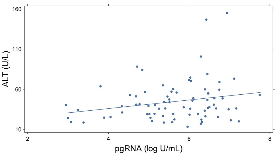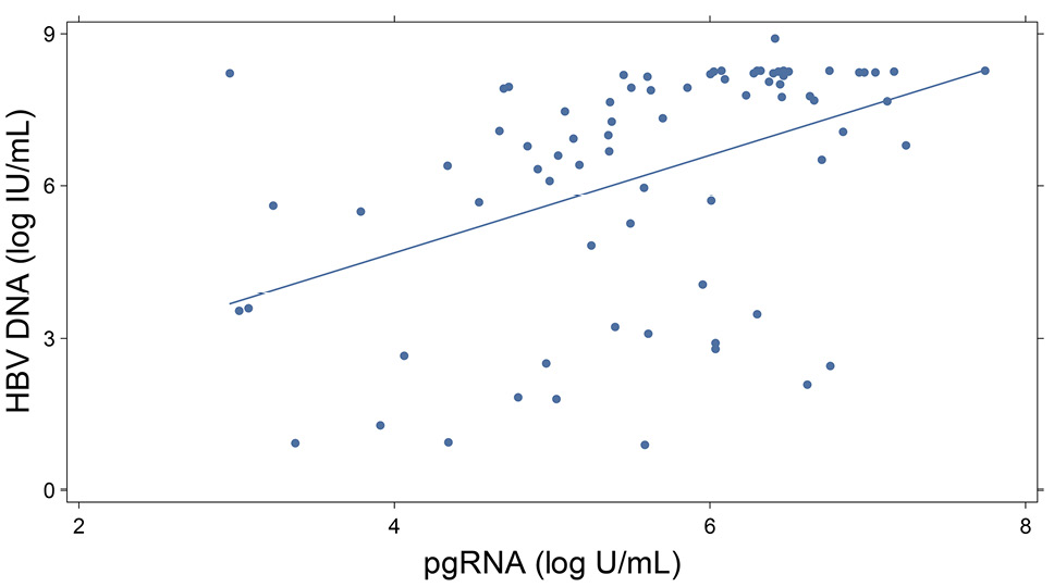 Conclusion: pgRNA and qHBsAg represent newer biomarkers of HBV replication that may help monitor response and treatment outcomes. HBV pgRNA is highly associated with both HBeAg and ALT and may predict both active replication from the closed circular DNA (cccDNA) template as well as hepatic injury.