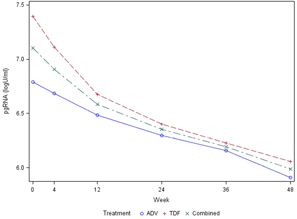 In the ACTG A5127 treatment trial, sample collection across several timepoints allowed for the assessment of HBV pgRNA decline curves. Figure 3 shows the decline curves for all subjects, as well as for treatment with adefovir versus tenofovir disoproxil fumarate. These results are consistent with a biphasic decline curve that reaches second-phase kinetics following week 12 of treatment. Following initiation of treatment, pgRNA declined more in individuals treated with TDF versus ADV at weeks 12 (0.24 log10 U/mL) and 48 (0.30 log10 U/mL), although this failed to reach statistical significance. Regression analysis showed that the rate of decline was significantly associated with age, race, treatment week, baseline ALT level, and baseline HBV DNA, (P < 0.05). Only 3 participants cleared HBV pgRNA relative to baseline levels.