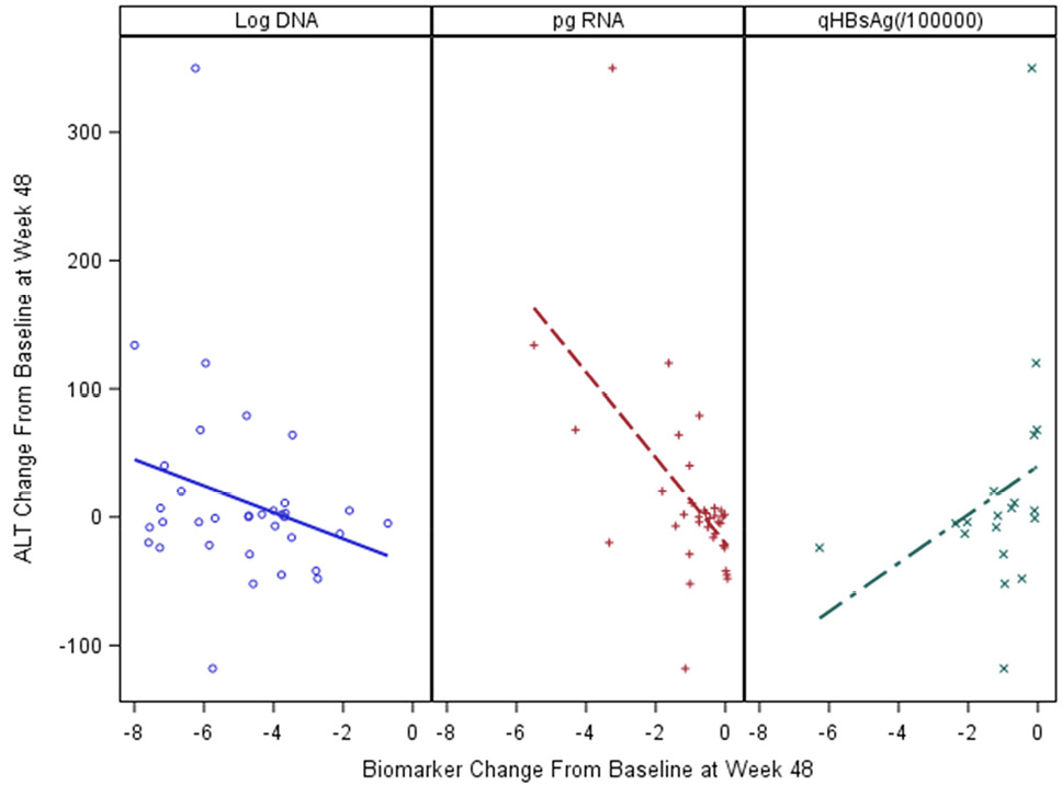 Figure 4. Changes in biomarker levels of active liver injury and relationship to ALT change from baseline to treatment week 48 in the ACTG cohort.
